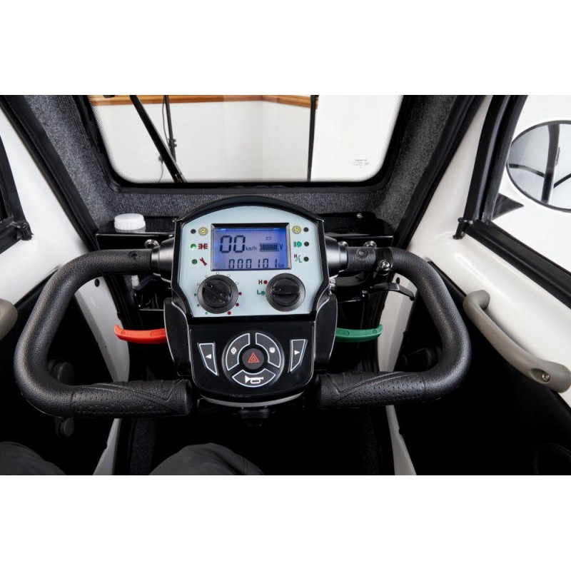 The impressive features don’t stop here, there is also a digital fascia which clearly shows the miles you have travelled together with your current speed, battery life, and temperature. The adjustable delta tiller handlebars are extremely comfortable and user-friendly controls allow you to adjust many of the Cabin Cars unique features such as; the lights, the indicators, the horn and the windscreen wiper.